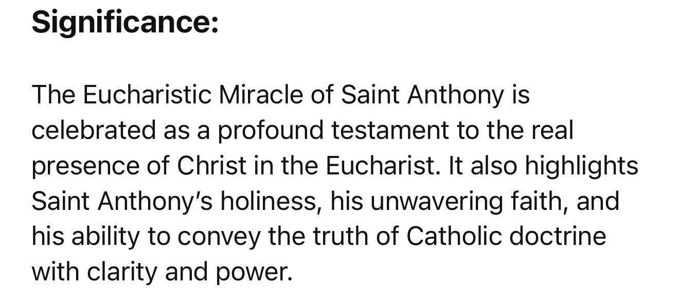 Saint Anthony’s reverence for the Eucharist was instrumental in spreading devotion to the Blessed Sacrament and countering heresies that denied the Real Presence. His legacy continues to inspire Eucharistic devotion and adoration in the Catholic Church.