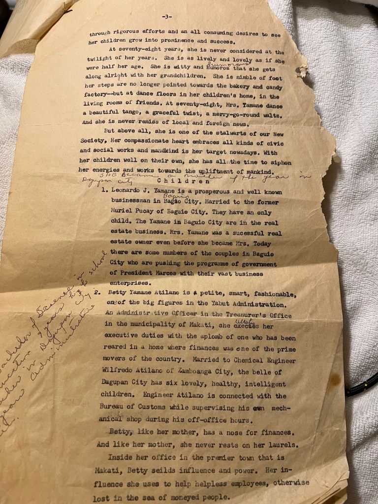 For years, Mrs. Yamane carried in, single handedly her children learning and money making. (Her bakery and candy factory prospered more after liberation and she bacame more industrious and enterprising as the needs of her children kept in growing. She became not only one of the business pillars of Dagupan City, she also became a civic worker, Catholic Action stalwart and at times, a social figure.