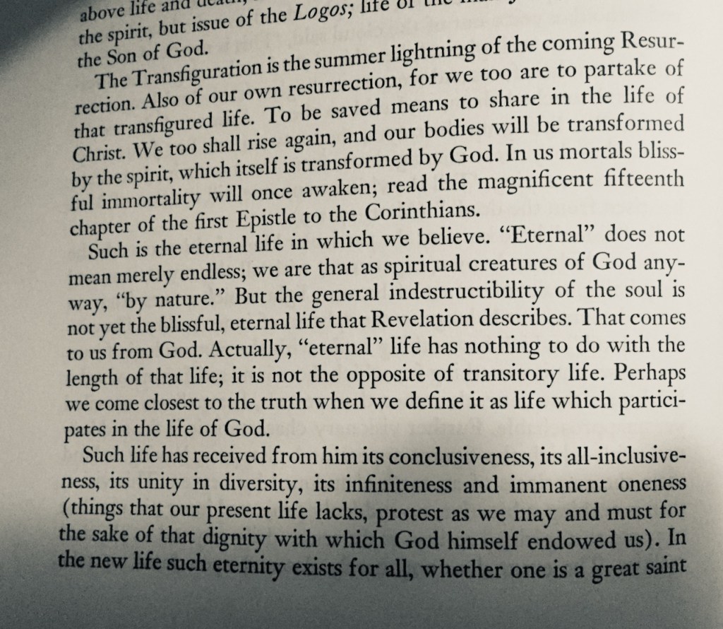 Such life has received from him its conclusiveness, its all-inclusive-ness, its unity in diversity, its infiniteness and immanent oneness (things that our present life lacks, protest as we may and must for the sake of that dignity with which God himself endowed us). In the new life such eternity exists for all, whether one is a great saint.