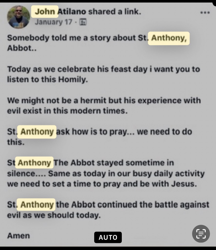 John Anthony. It’s likewise his birthday and then he pointed at Saint Anthony and said look he is waving at us.