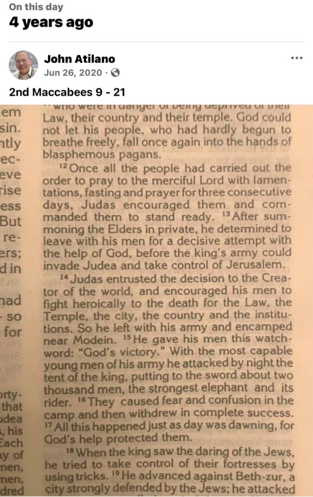 “Once all the people had carried out the order to pray to the merciful Lord with lamentations, fasting and prayer for three consecutive days, Judas encourage and commanded them to stand ready.
