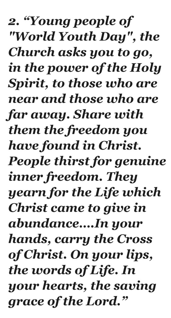 “Dear young people, you know that Christianity is not an opinion nor does it consist of empty words. Christianity is Christ! It is a Person, a Living Person! To meet Jesus, to love him and make him loved: this is the Christian vocation. Mary was given to you to help you enter into a more authentic and more personal relationship with Jesus. Through her example, Mary teaches you to gaze on him with love, for He has loved us first. Through her intercession, she forms in you a disciple’s heart able to listen to her Son, who reveals the face of his Father and the true dignity of the human person.” Pope John ll