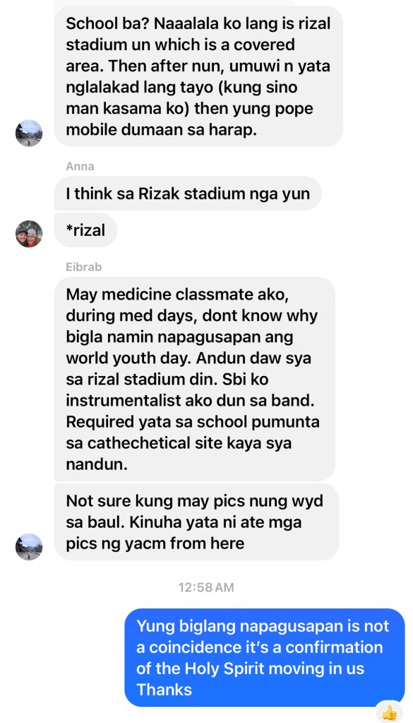 March 18, 2025 — During our KB NORCAR (Kabataang Barangay Alumni Association) gathering, one of our members shared with me that she had attended World Youth Day. She was still very young at the time, so their group was positioned near the grandstand.