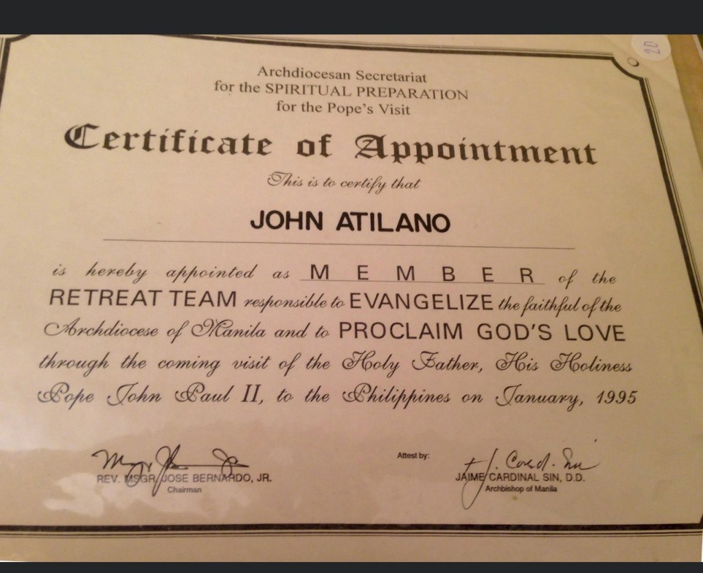 JOHN is hereby appointed as ME M B E R of the RETREAT TEAM responsible to EVANGELIZE the faithful of the Archdiocese of Manila and to PROCLAIM GOD’S LOVE through the coming visit of the Holy Father, His Holiness Pope John Paul II, to the Philippines on January, 1995