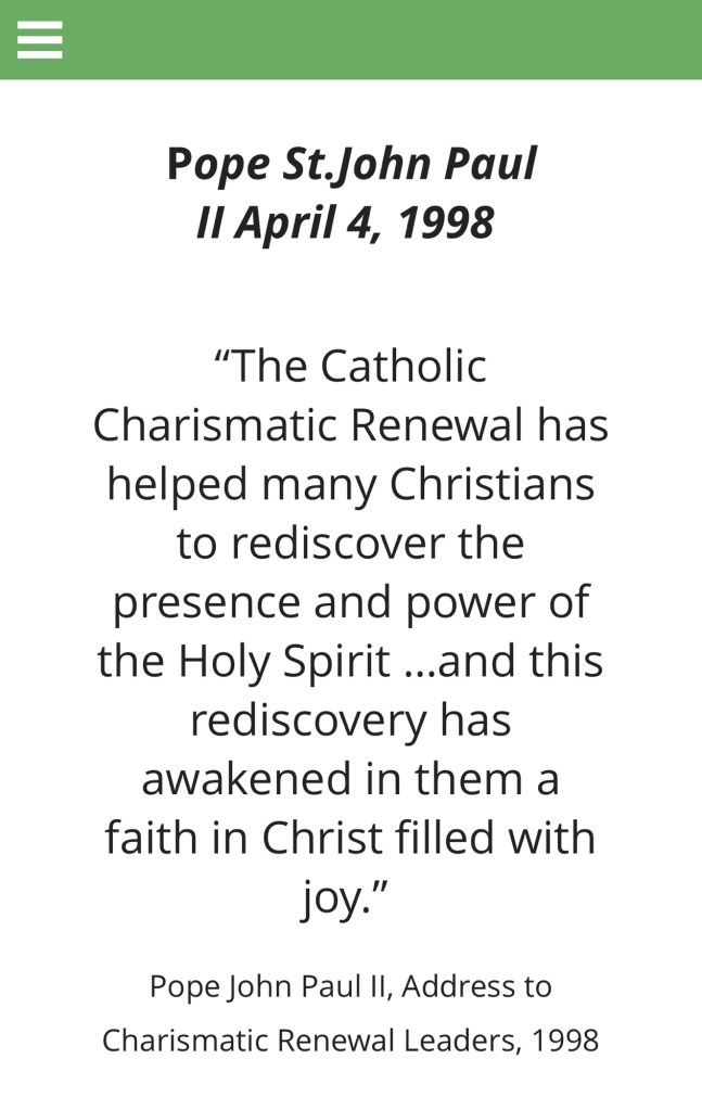The Catholic charismatic movement is one of the many fruit of the Second Vatican Council, which, like a new Pentecost, led to an extraordinary flourishing in the Church’s life of groups and movements particularly sensitive to the action of the Spirit.How can we not give thanks for the precious spiritual fruits that the Renewal has produced in the life of the Church and in the lives of so many people? How many lay faithful – men. women, young people, adults and the elderly – have been able to experience in their own lives the amazing power of the Spirit and his gifts! How many people have rediscovered the faith, the joy of Prayer, the power and beauty of the Word of God, translating all this into generous service in the Church’s mission! How many lives have been profoundly changed! For all this today, together with you, I wish to praise and thank the Holy Spirit.”