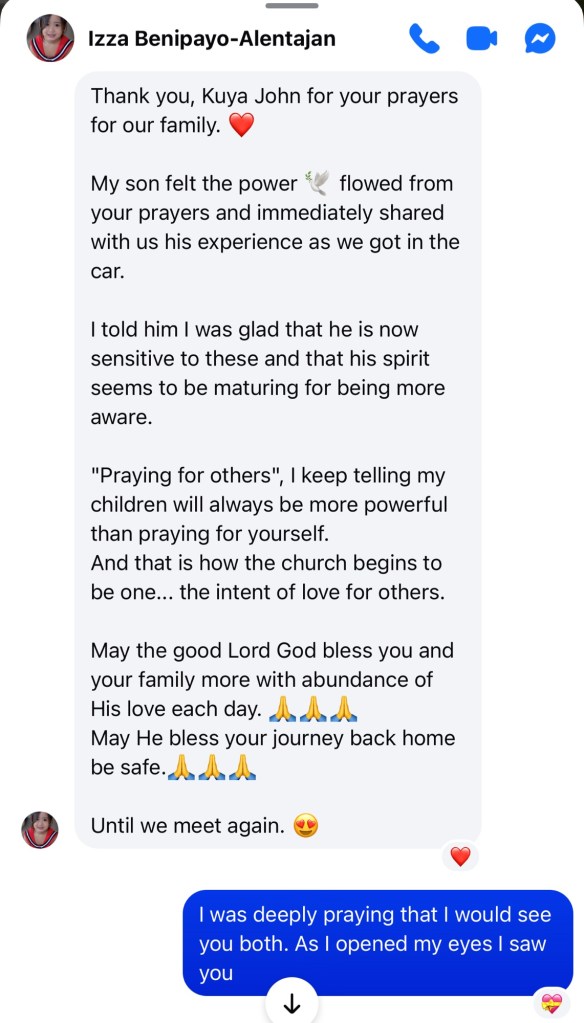 I reached out to Fr. Flavie and asked if he could bless my mother, even just through Zoom. With great kindness, he responded that he was currently on a retreat outside of Manila—but he didn’t stop there. He said he would find a way.