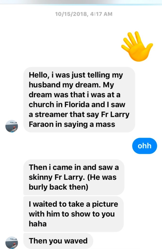 Elba dreamt of Father Faraon on the day I was scheduled to attend a spiritual conference September 22, 2018 and when she woke up same time I waved said Hi.