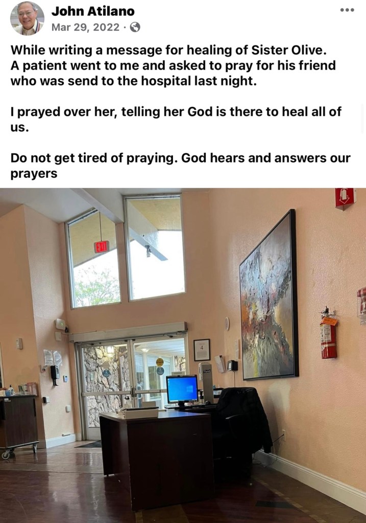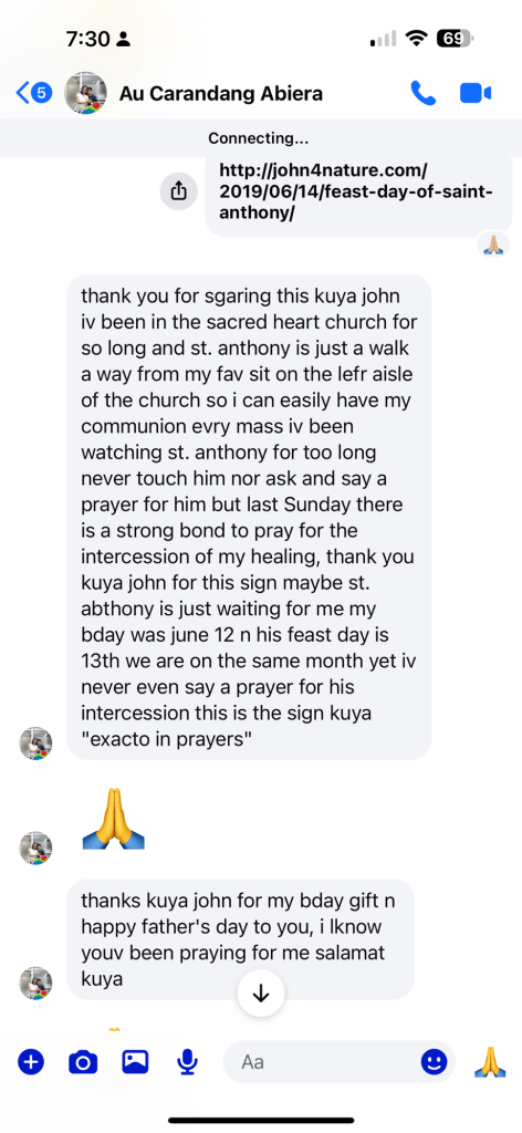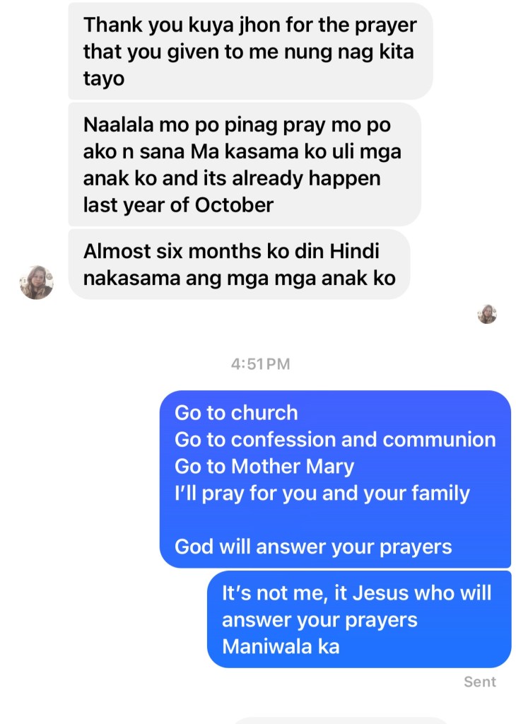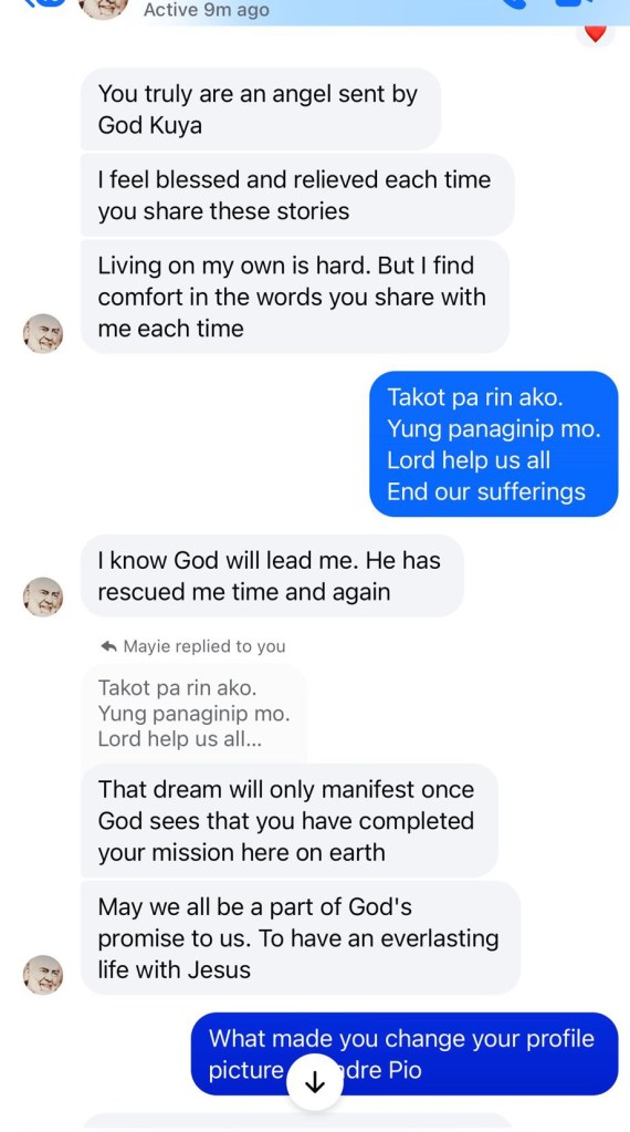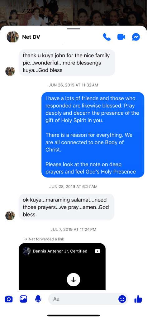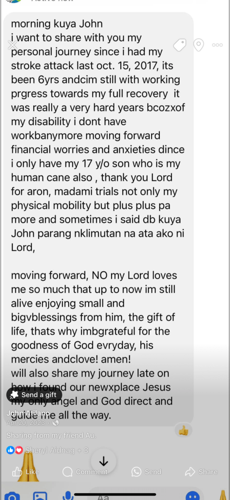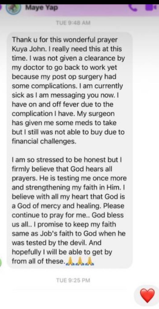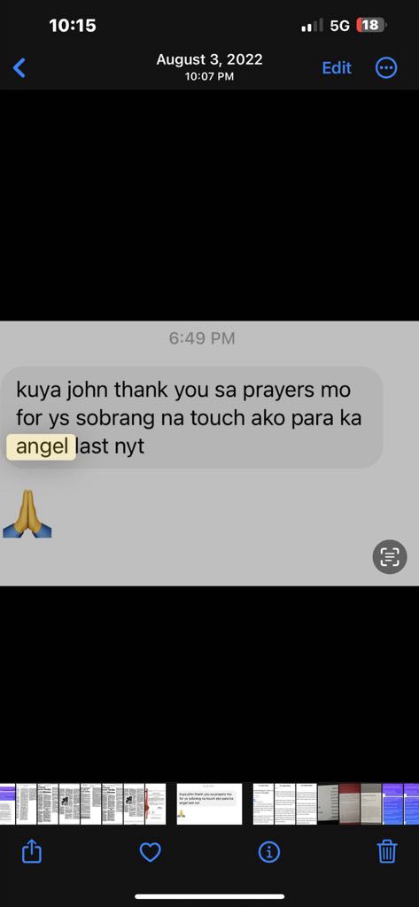 To be honest, my condition is not improving. I have been ill and trying my best to be strong and fighting with the help and mercy of God. I am lucky and happy to have Kuya John as my spiritual brother. Godn is with him. He continues to propagate God’s wisdom and blessings thru his talks. I know one day, like anyone else who have lived in this world, my time will come where I will be called to return home to my Creator. And when that time comes, I will be happy to tell God that one of His best creation was the one who guided me to continue to hold on to my faith and never let go. Thank You God. Thank You Jesys.. Thank you Kuya John.. 🙏🙏🙏