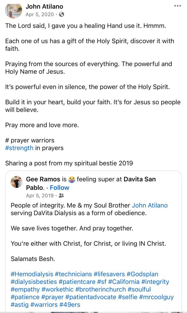 For some reason, I felt a strong prompting from the Holy Spirit to pray over a patient. Silently, I approached a man seated in the dialysis area. Gently, I asked if it would be okay to pray for his healing. He said yes.