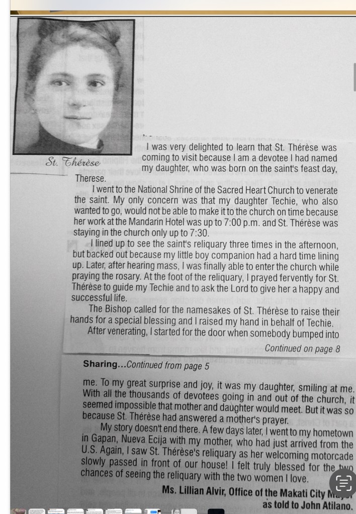 “At that time, I was also praying fervently to Saint Thérèse, asking her to guide my daughter, Techie, and to intercede with the Lord for her to have a joyful and successful life.