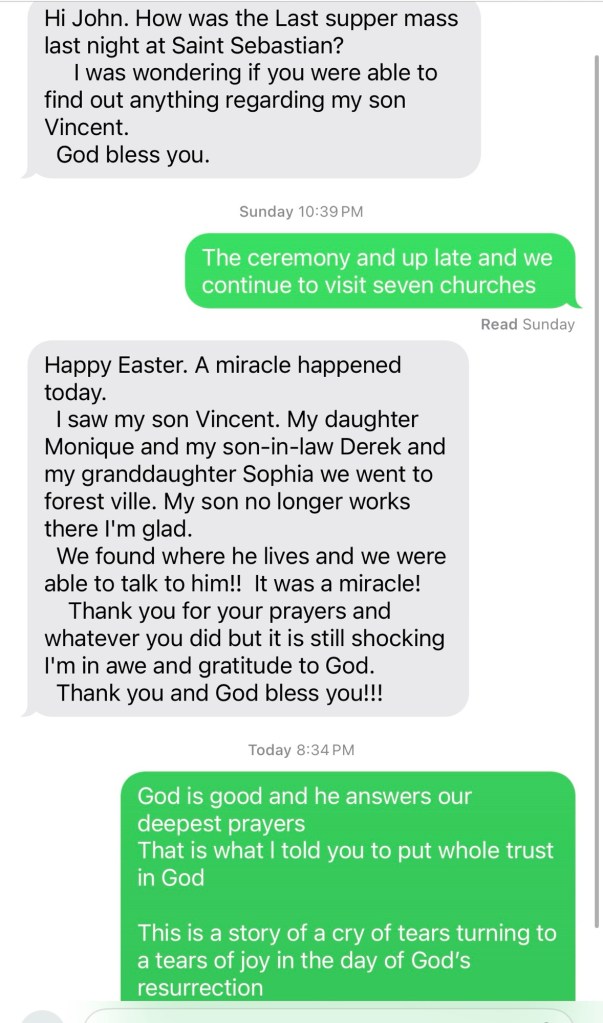 During Holy Thursday, she was not with us, but as we attended Mass and continued the tradition of visiting the seven churches, I carried her prayer in my heart. I continued to pray for her, for her son, for that reunion she had been longing for.